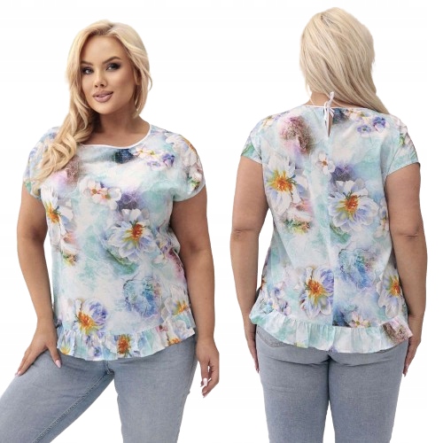 Bluzka SANDRA krój kimono z falbaną wzór kwiaty turkusowe rozmiar 44